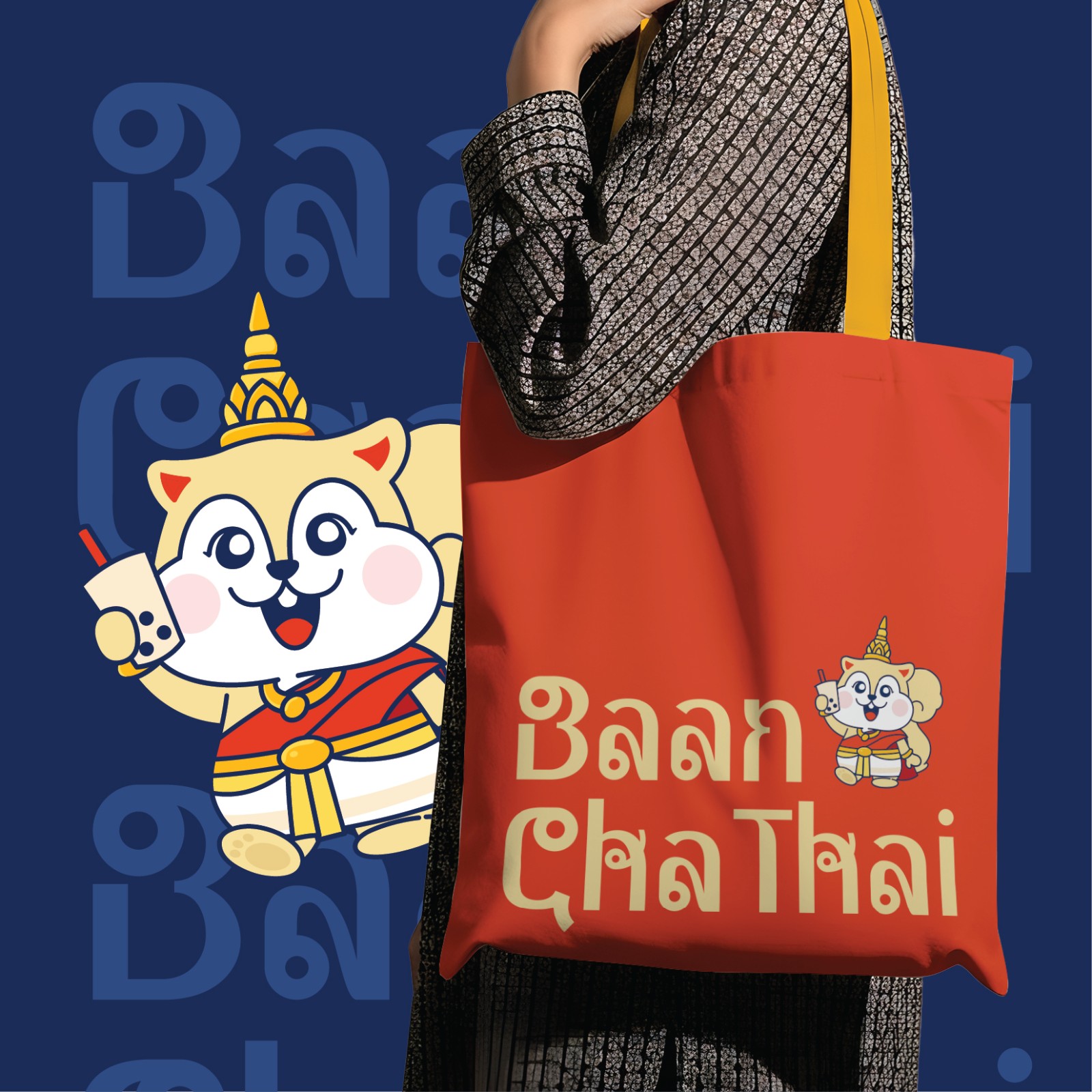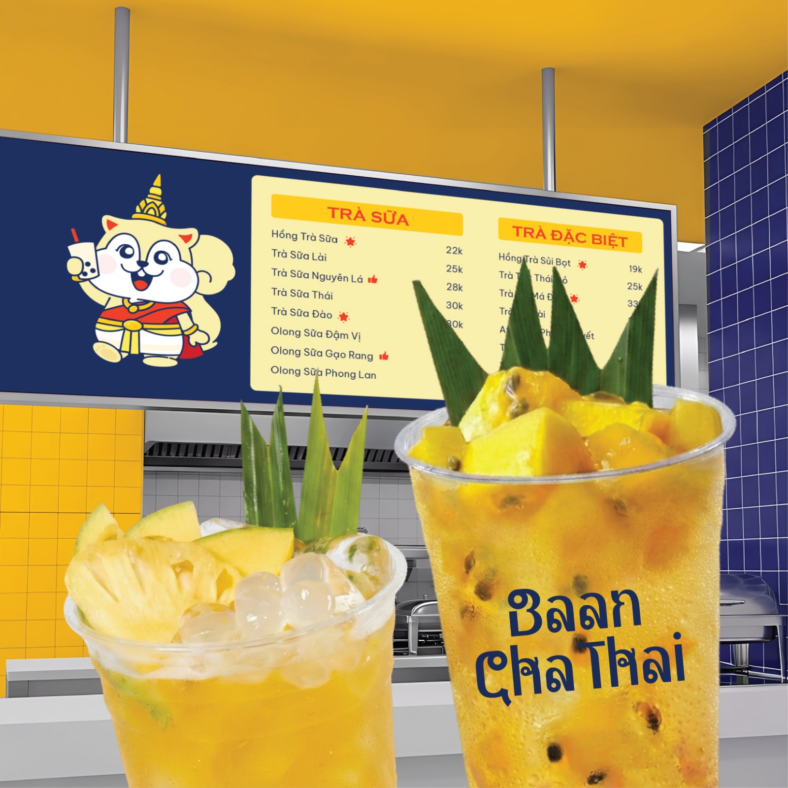 Gam màu xanh navy làm nền để tôn lên sắc vàng - đỏ rực rỡ, vừa gợi tinh thần Thái Lan vừa tạo độ nhận diện mạnh mẽ. Typography mềm mại, bo tròn đồng bộ với mascot, giúp logo dễ dàng ứng dụng trên ly nhựa, bảng hiệu, bao bì hay social media mà vẫn giữ được nét đáng yêu đặc trưng.