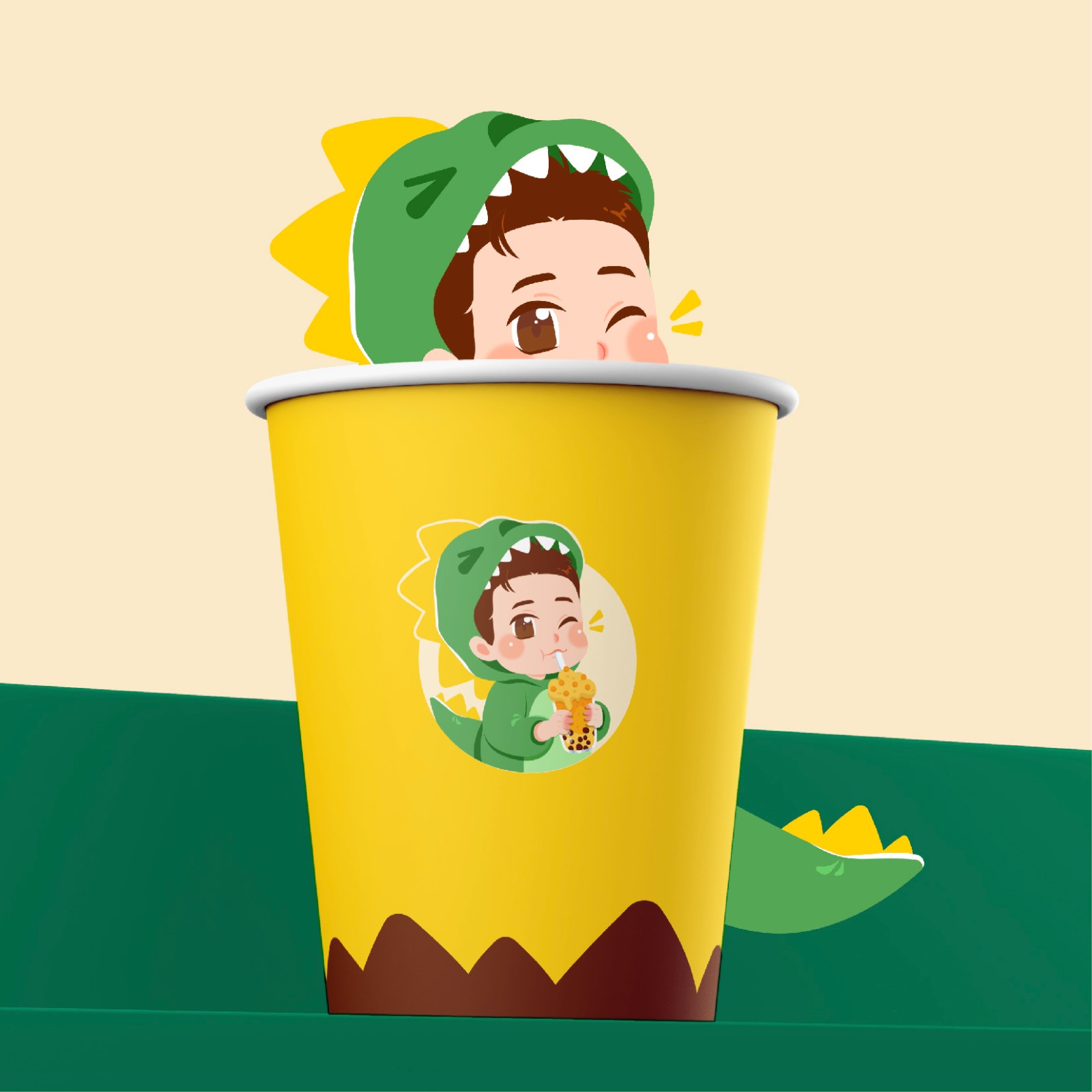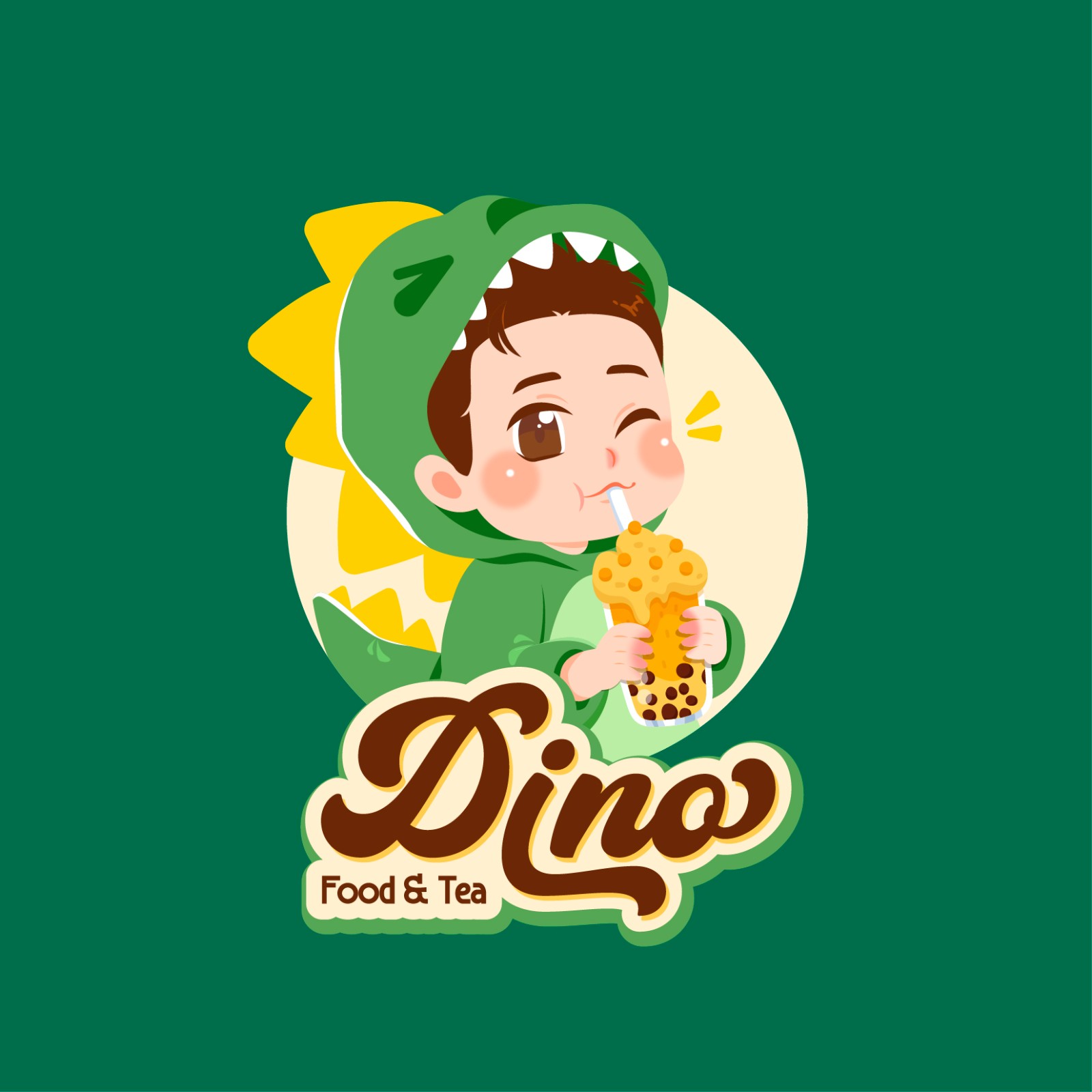 Điểm nhấn của logo chính là nhân vật mascot bé Dino - một em bé đáng yêu trong bộ đồ khủng long xanh đang thưởng thức ly trà sữa. Hình ảnh này không chỉ tạo cảm giác gần gũi, mà còn truyền tải tinh thần vui nhộn, năng động đúng với vibe của một thương hiệu trà sữa hướng đến học sinh, sinh viên.