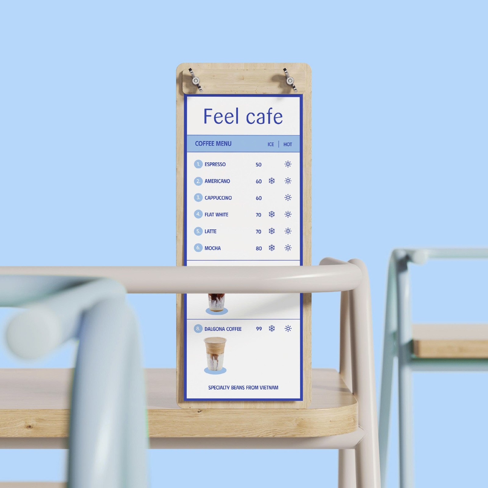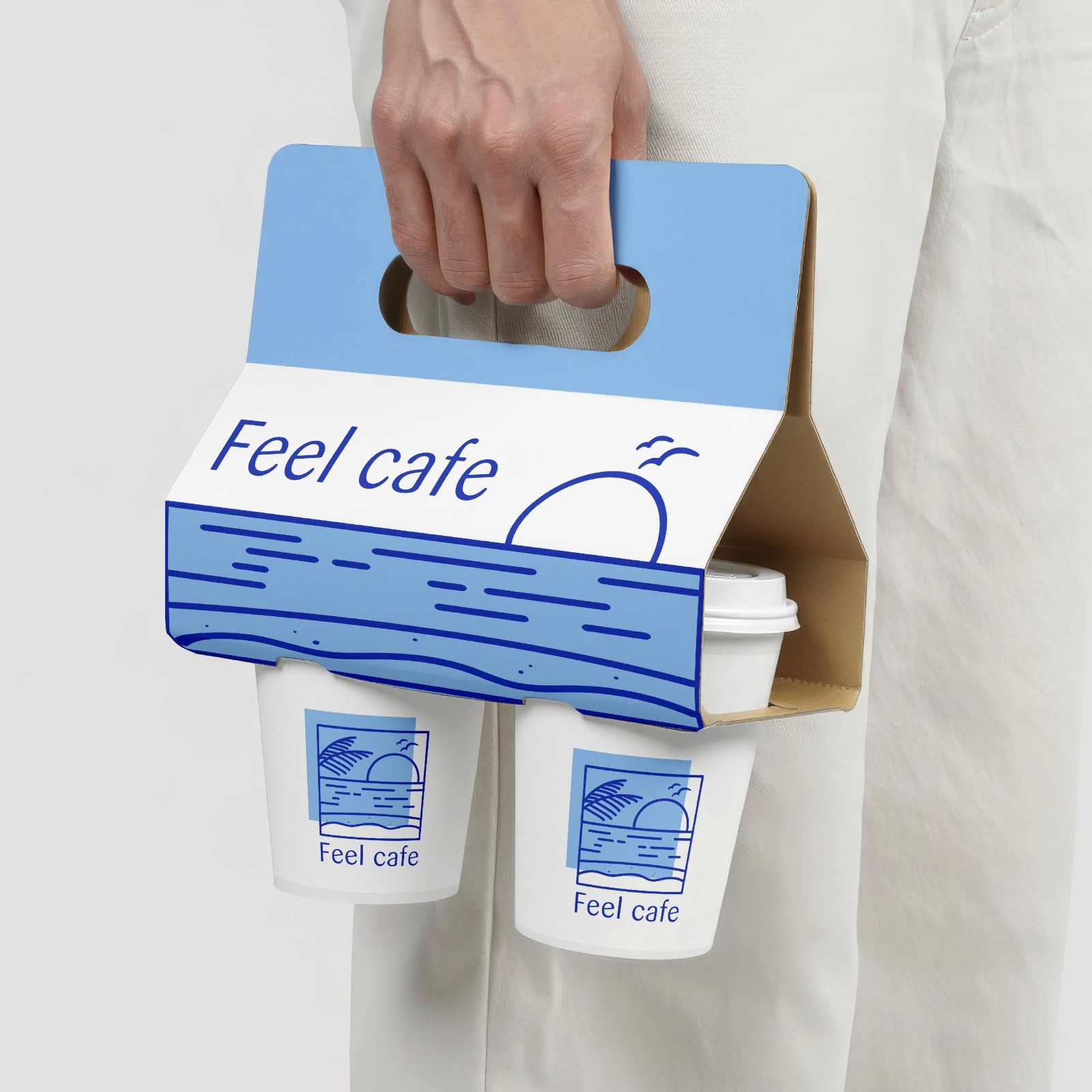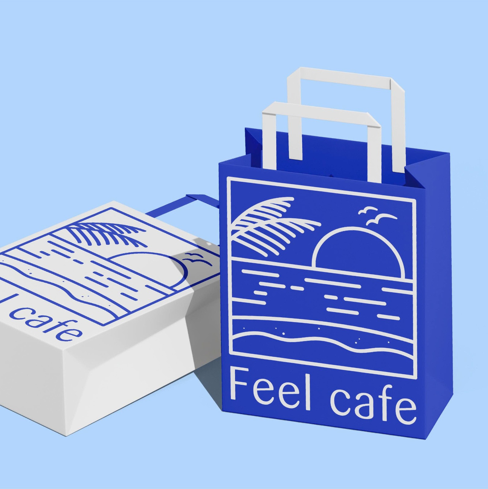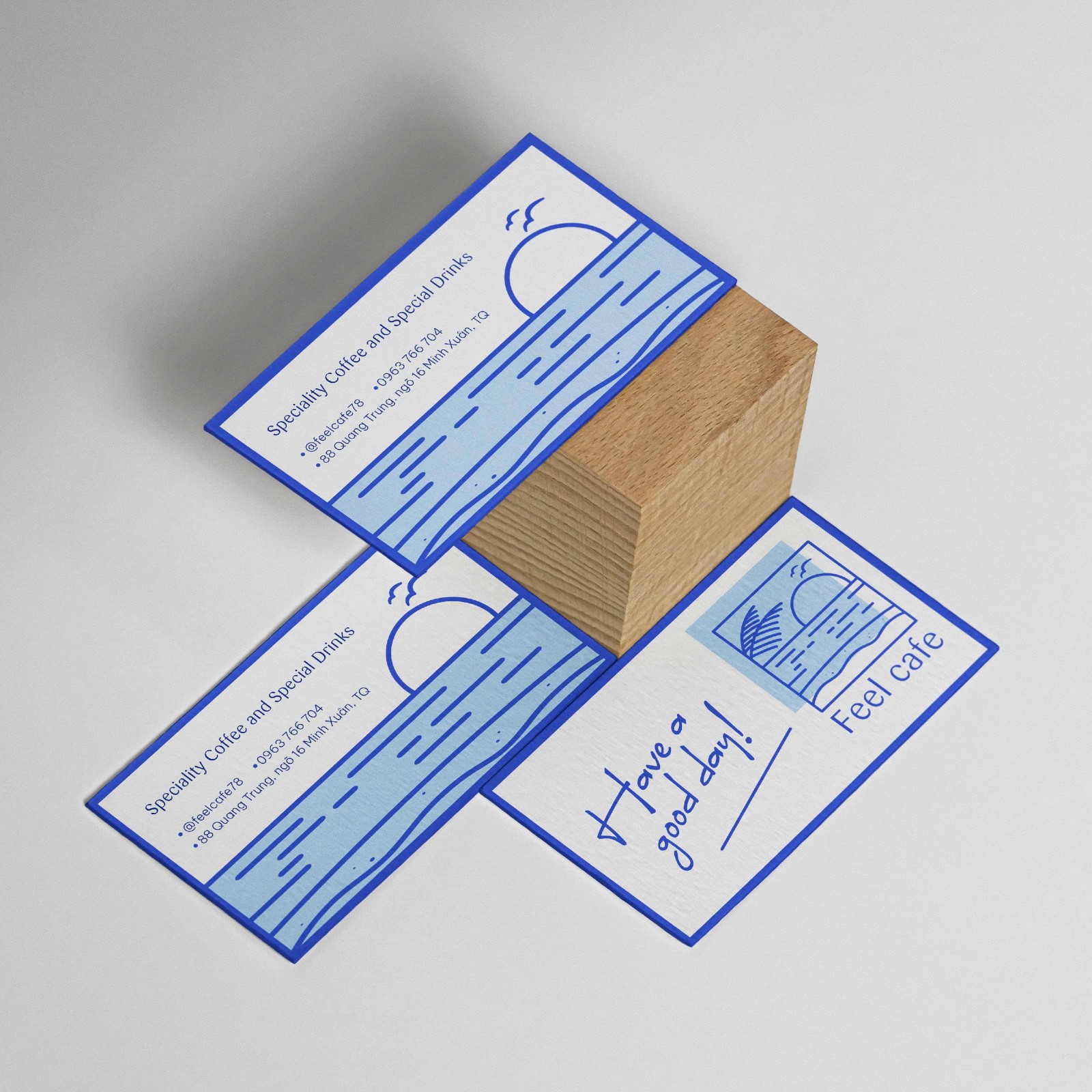 Bố cục hình vuông gọn gàng tượng trưng cho không gian vững chãi, đáng tin cậy của quán, trong khi đường cong mềm mại của sóng và mặt trời khơi gợi sự nhẹ nhàng chính là cảm giác mà Feel cafe muốn trao gửi tới mỗi vị khách khi ghé thăm. Từ màu sắc xanh biển trầm lắng đến cấu trúc phẳng hiện đại, logo không chỉ là một dấu ấn nhận diện mà còn là lời mời: "Hãy dừng lại một chút, và để Feel cafe chạm vào cảm xúc của bạn."