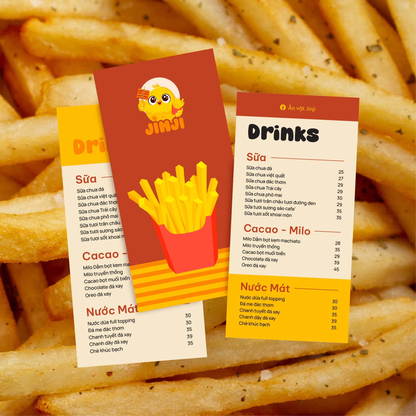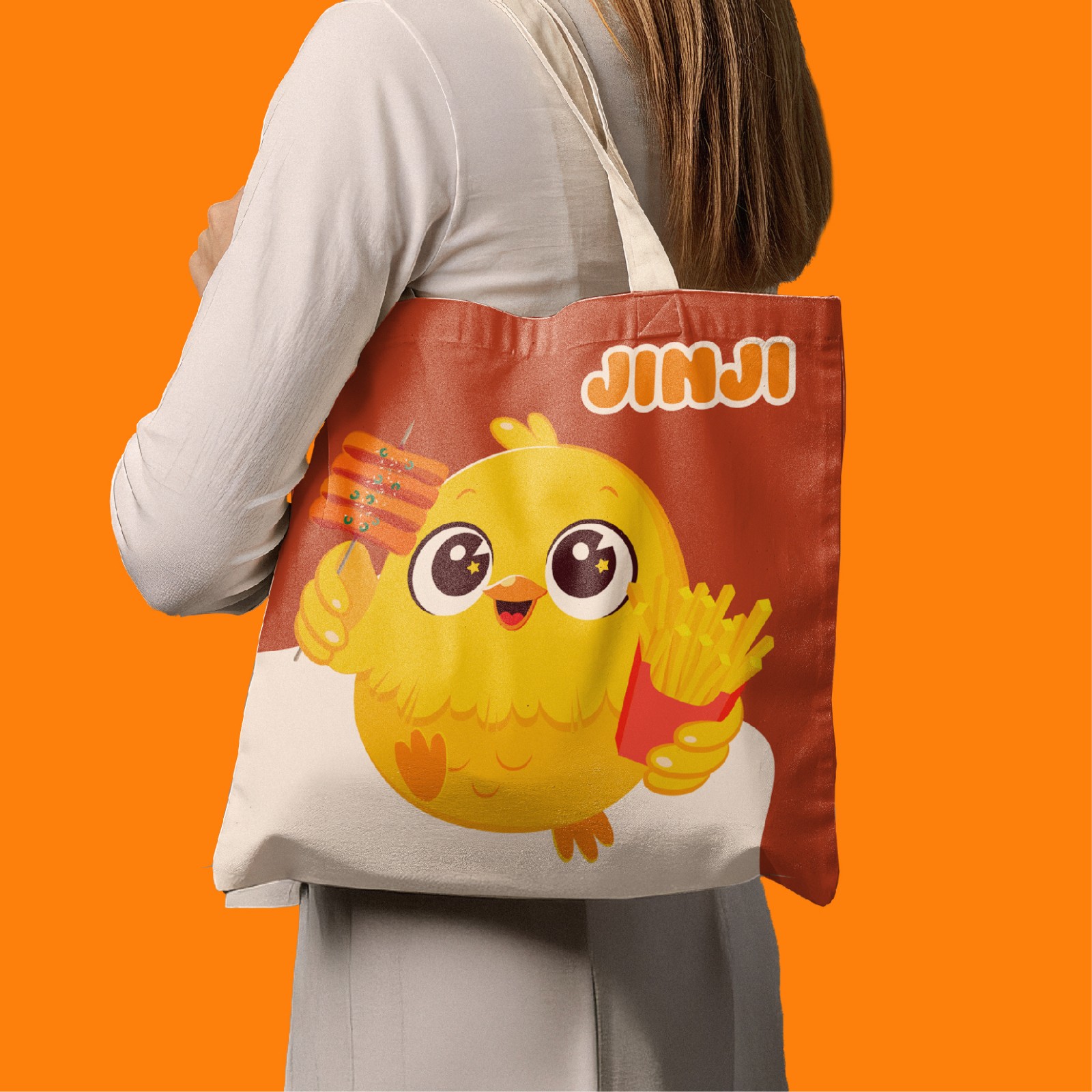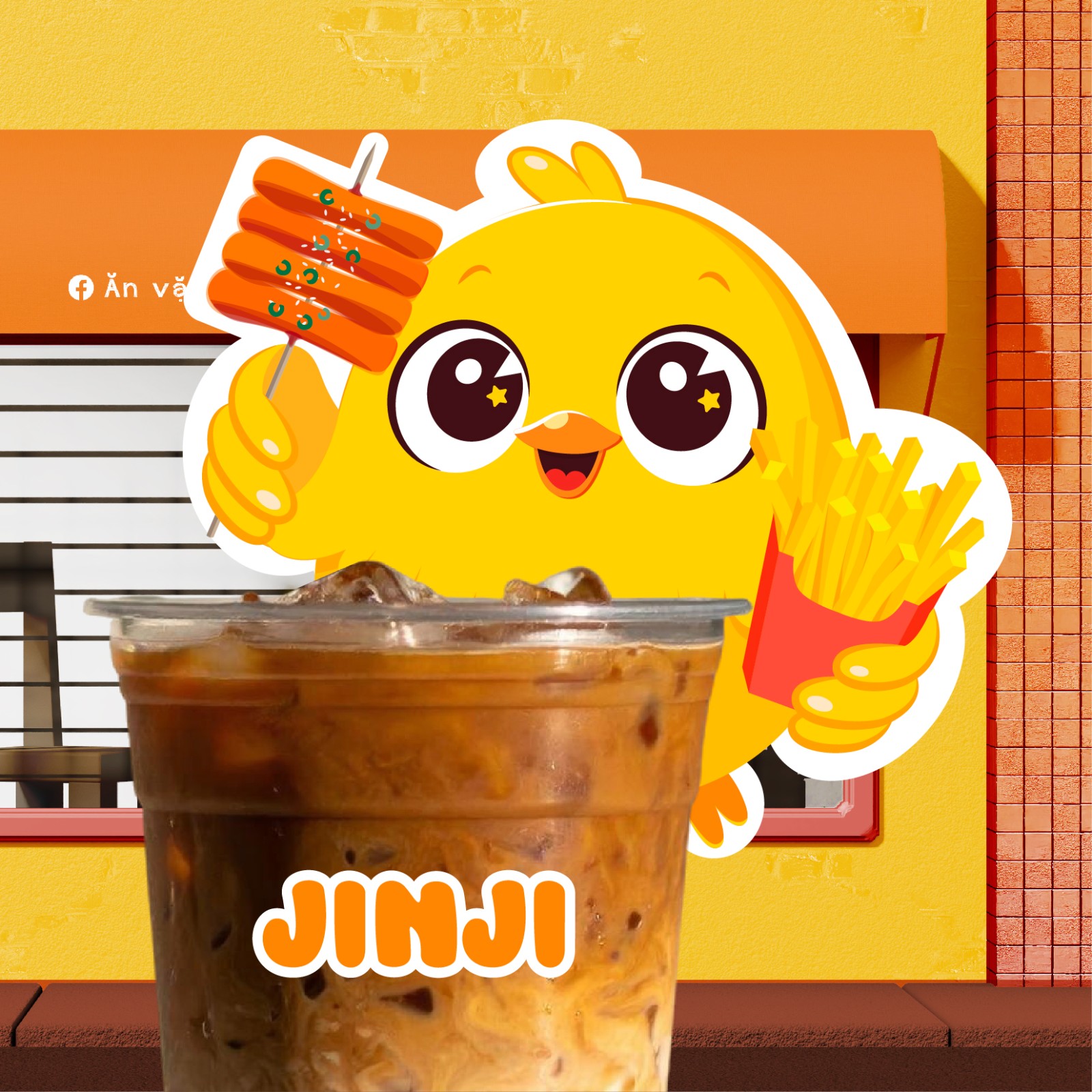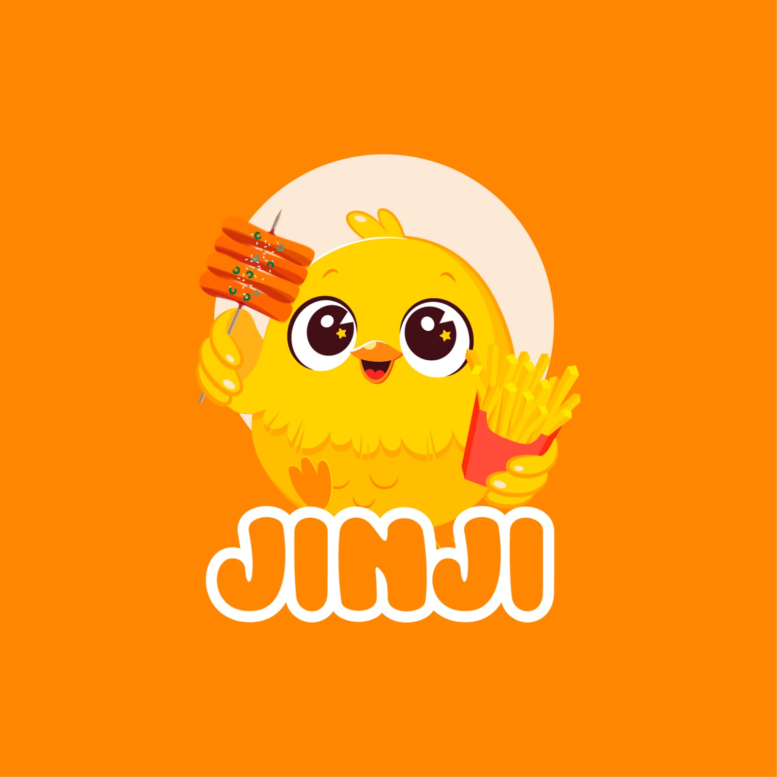Typography “JINJI” bo tròn, mềm mại, đồng bộ với phong cách mascot, tăng tính thân thiện và khả năng ứng dụng linh hoạt trên bao bì, bảng hiệu, sticker hay social media.