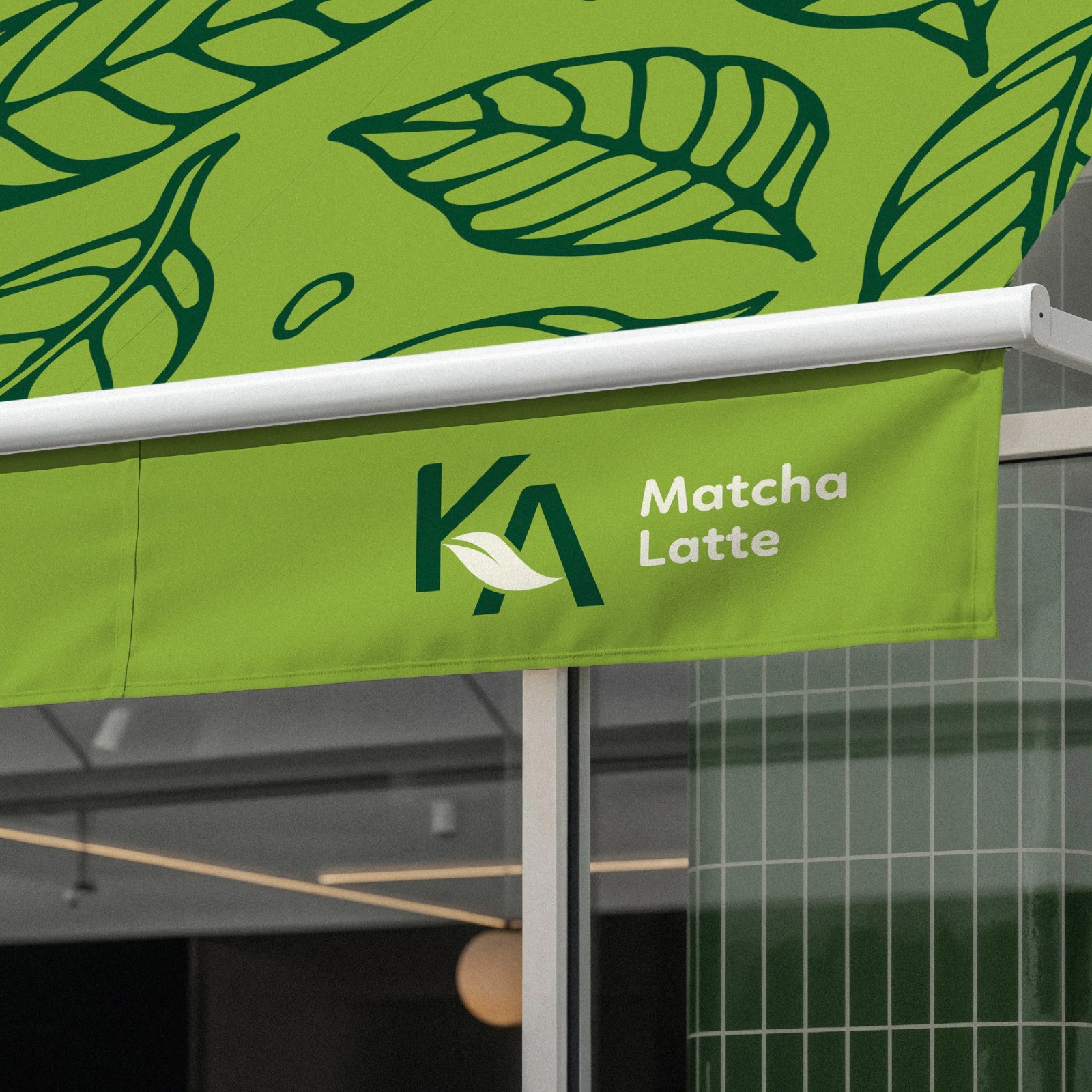 Logo được tạo nên từ hai chữ cái K & A, viết tắt tên thương hiệu, với tạo hình gọn gàng và hiện đại. Điểm nhấn là chiếc lá matcha được lồng ghép khéo léo ở trung tâm, đại diện cho nguyên liệu cốt lõi, đồng thời gợi lên cảm giác organic, healthy và thân thiện với môi trường. Tất cả được đặt trên nền xanh tươi sáng, sự tươi mới và năng lượng tích cực.