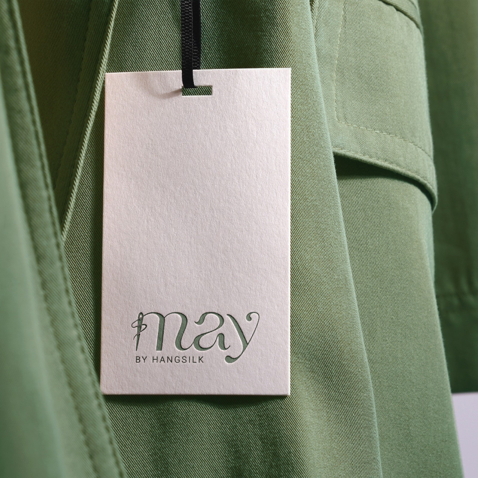 Ở trung tâm của thiết kế, chữ “M” được cách điệu với đường chỉ mảnh quấn quanh đầu kim, một chi tiết nhỏ nhưng đầy chủ đích. Đó không chỉ là yếu tố trang trí, mà là nút thắt biểu tượng cho tinh thần thủ công thể hiện được tâm hồn người thợ gửi gắm trong từng đường may. Đường chỉ mềm mại ấy cũng chính là sợi kết nối giữa truyền thống nghề may và thẩm mỹ đương đại mà HANGSILK theo đuổi.