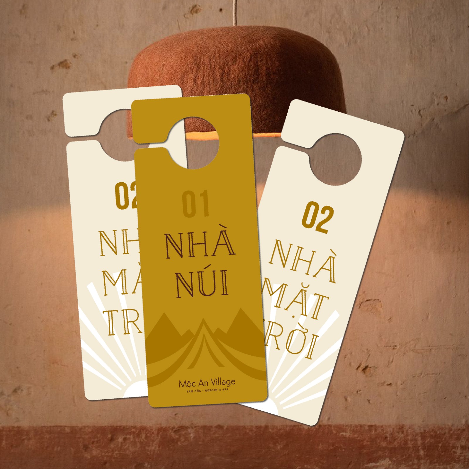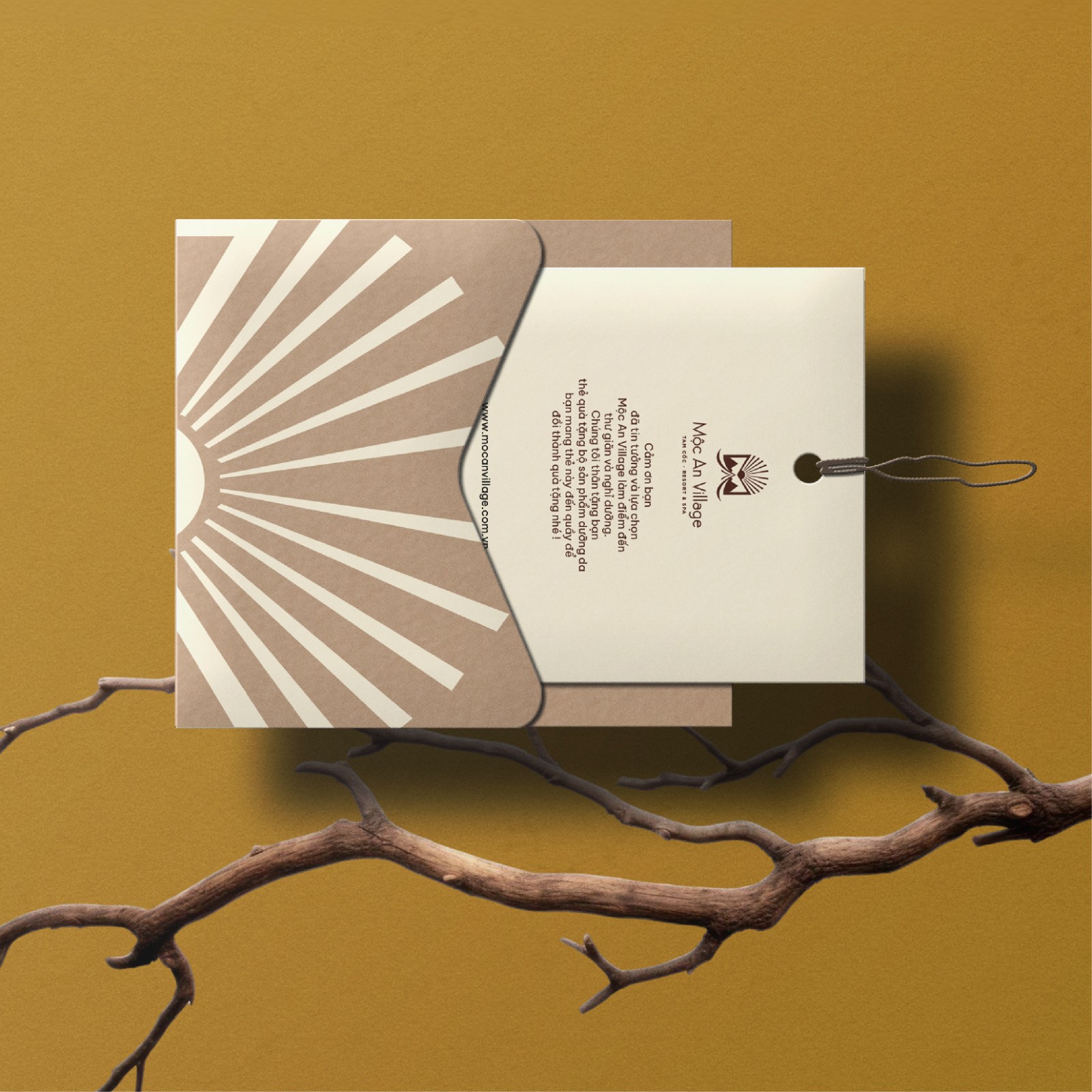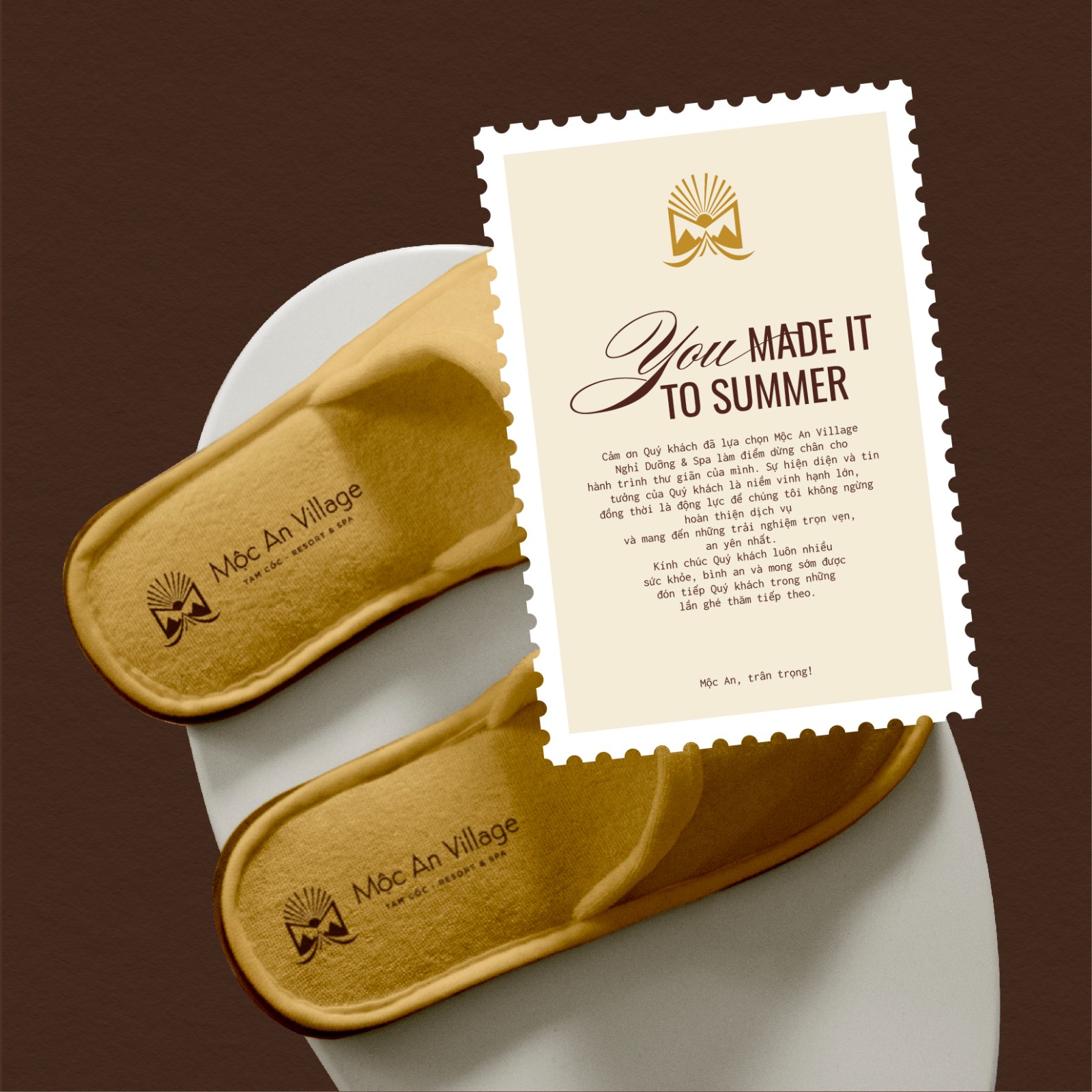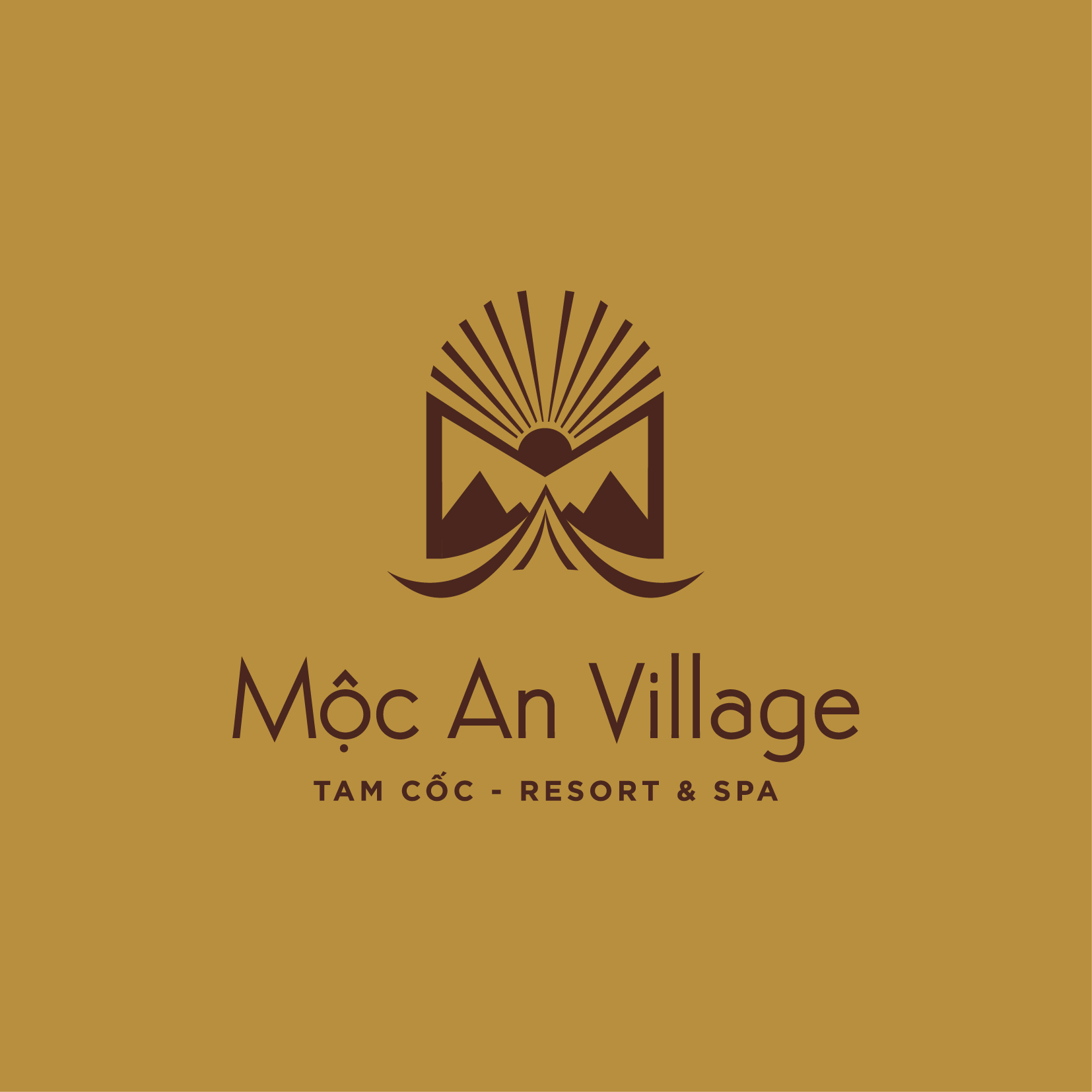 Phần typography “Mộc An Village” được xử lý thanh thoát, hiện đại, tạo cảm giác tinh tế và chuyên nghiệp. Dòng “Tam Cốc - Resort & Spa” phía dưới đóng vai trò định vị rõ ràng, đảm bảo tính nhận diện khi ứng dụng trên bảng hiệu, ấn phẩm truyền thông, đồng phục hay các vật phẩm trong khu nghỉ dưỡng.