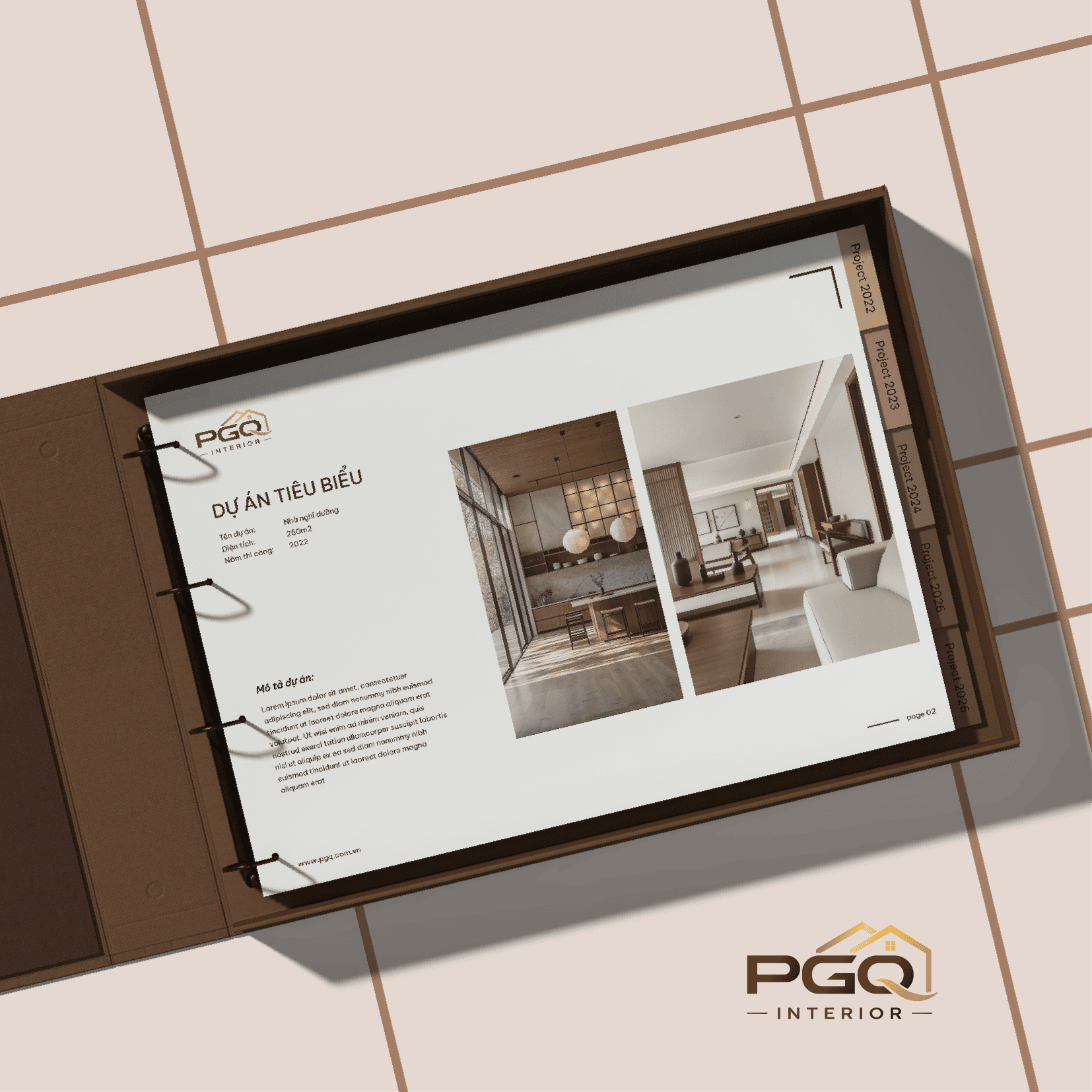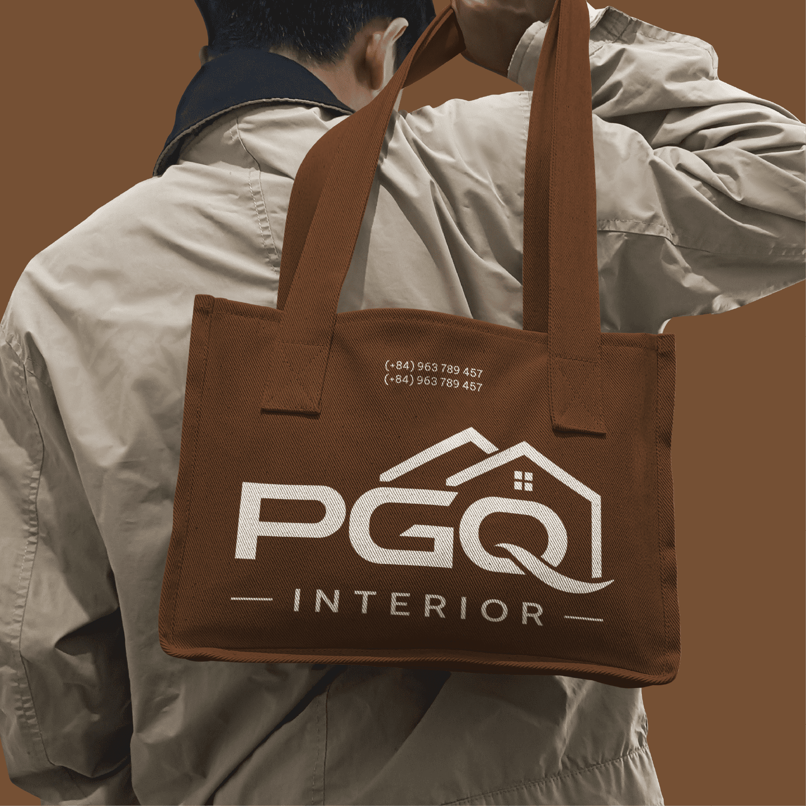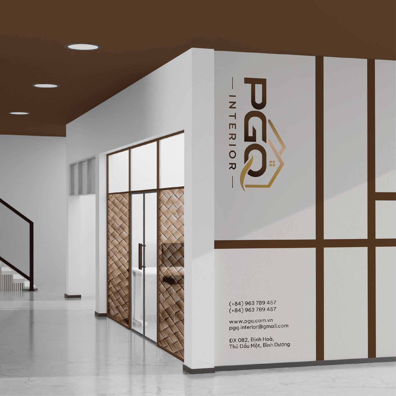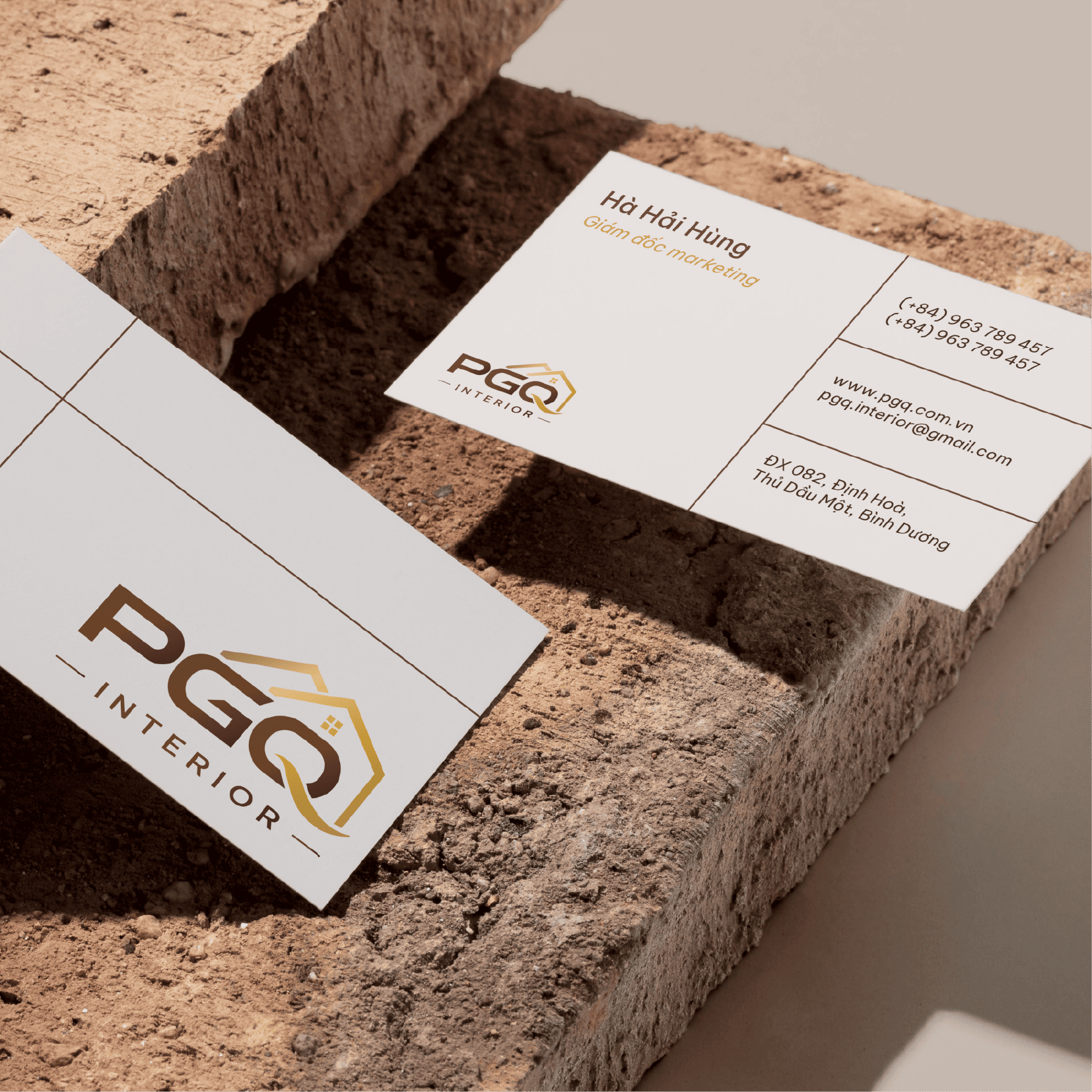 Mảnh ghép cuối cùng hoàn thiện bức chân dung thương hiệu là phông chữ Sans-serif dày bản và hiện đại. Những nét chữ vuông vức được tinh chỉnh riêng để tạo cảm giác tối giản nhưng cực kỳ chắc chắn, thể hiện tinh thần minh bạch trong từng bước thi công. Đặc biệt, khoảng cách chữ “INTERIOR” được mở rộng chủ đích, tạo độ thoáng đãng như cách PGQ tối ưu không gian sống: ngăn nắp, hiện đại và luôn đầy ắp những khoảng thở quý giá.