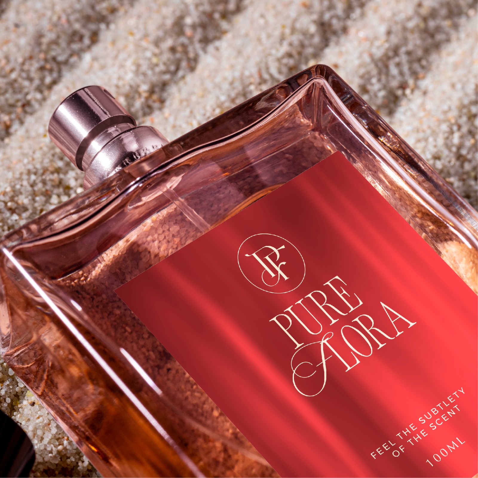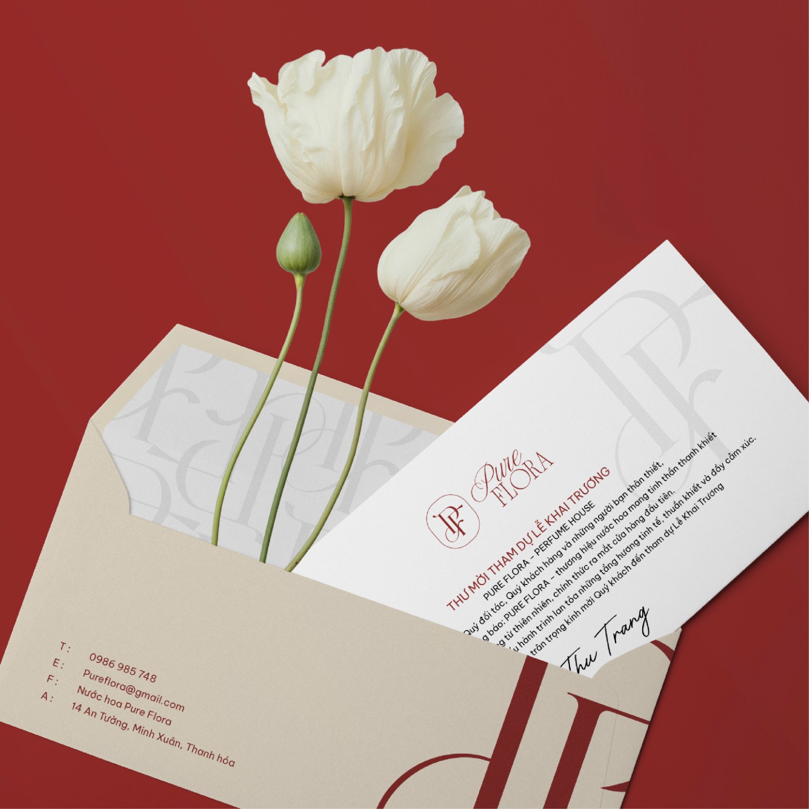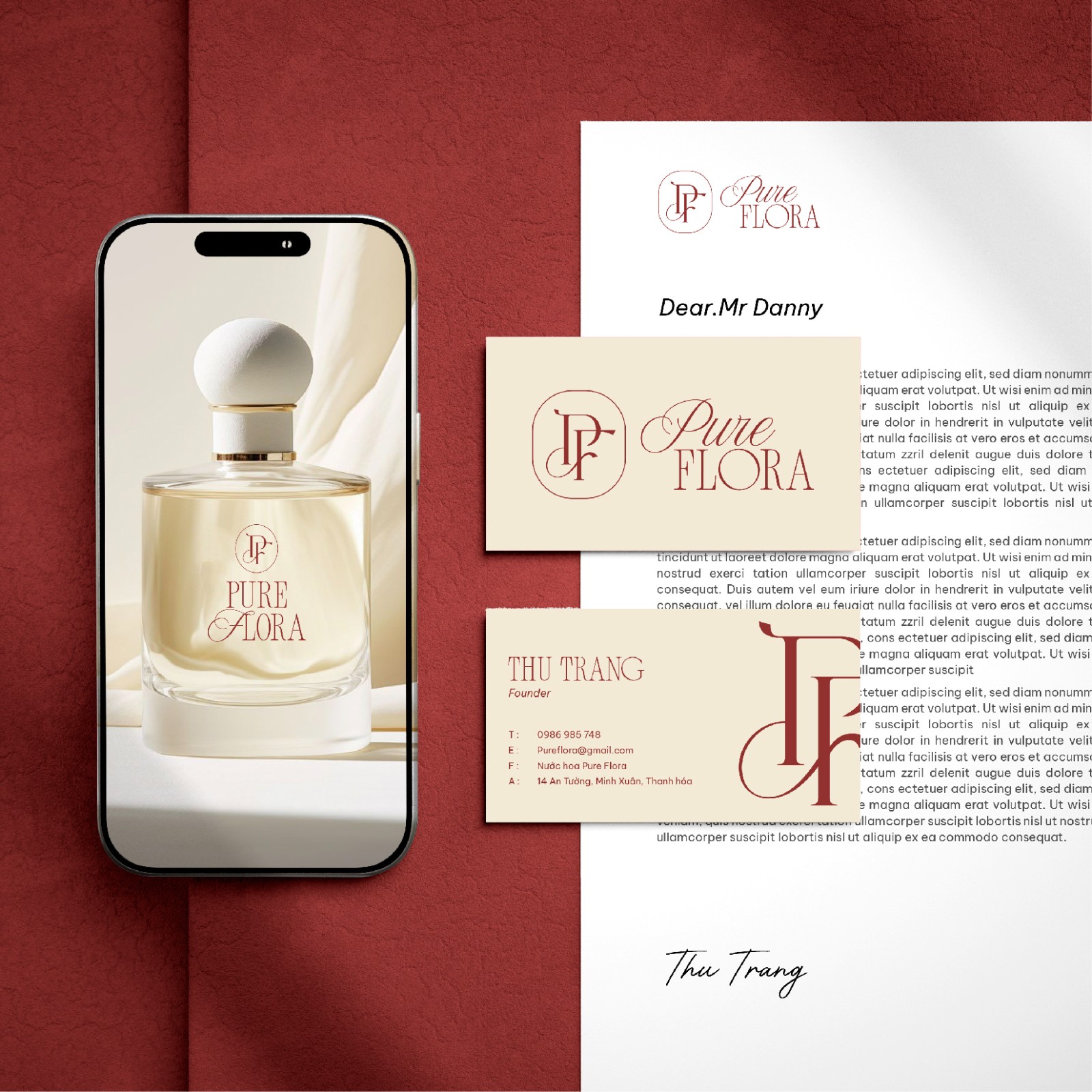 Logo của thương hiệu mang đúng cảm giác “thoảng qua nhưng lưu luyến”, nhẹ nhàng mà vẫn tạo dấu ấn sâu sắc ngay từ giây đầu tiên. Biểu trưng PF được đặt trong khung bo tròn, gợi sự mềm mại nhưng không kém phần chuẩn mực. Những nét chữ uyển chuyển được xử lý tinh tế nhằm tái hiện cảm giác của một làn hương đang lan tỏa: dịu dàng, uyển chuyển và đầy tính nghệ thuật. Phần chữ Pure Flora sử dụng kiểu serif thanh lịch, giúp tổng thể logo toát lên vẻ sang trọng, nữ tính của một boutique nước hoa cao cấp.