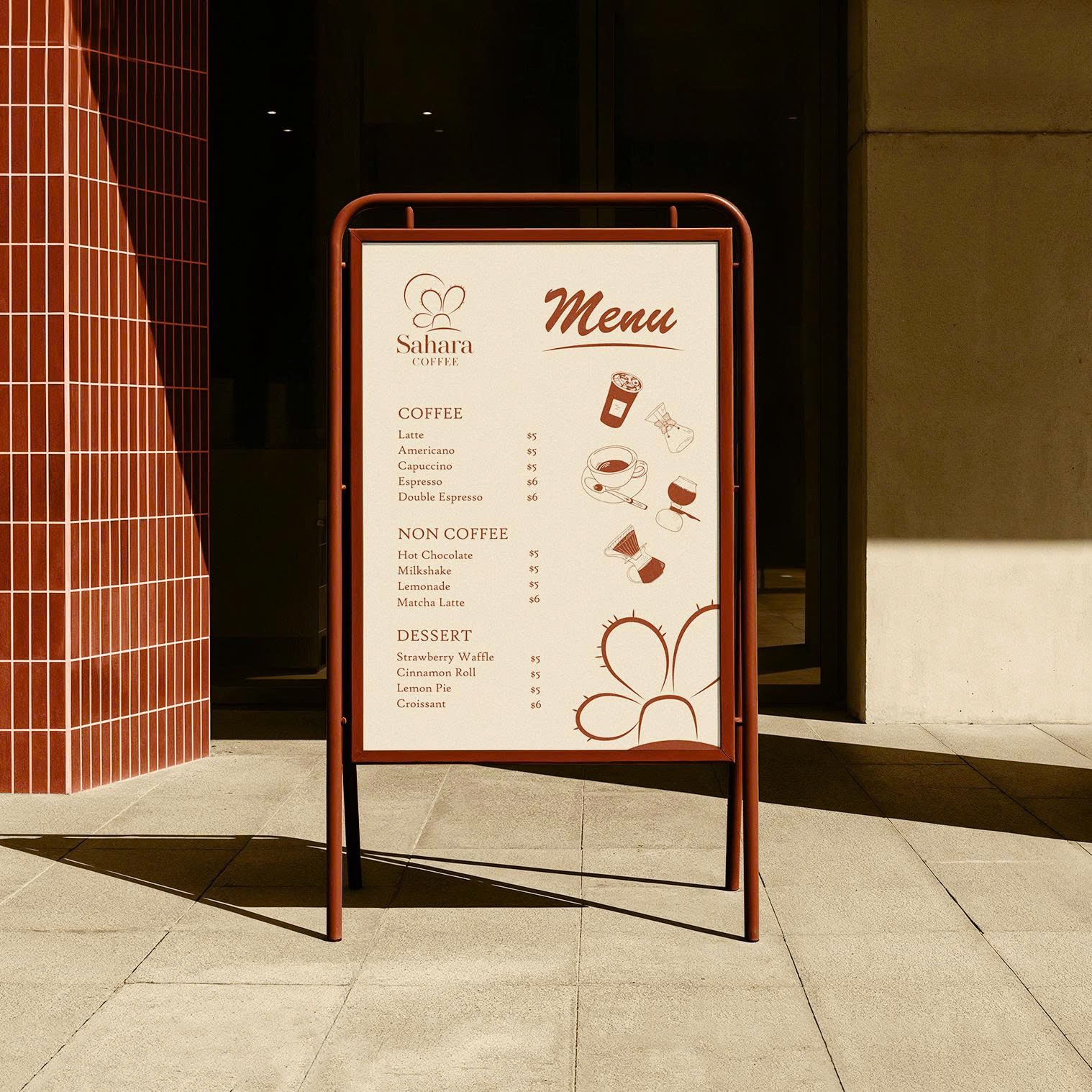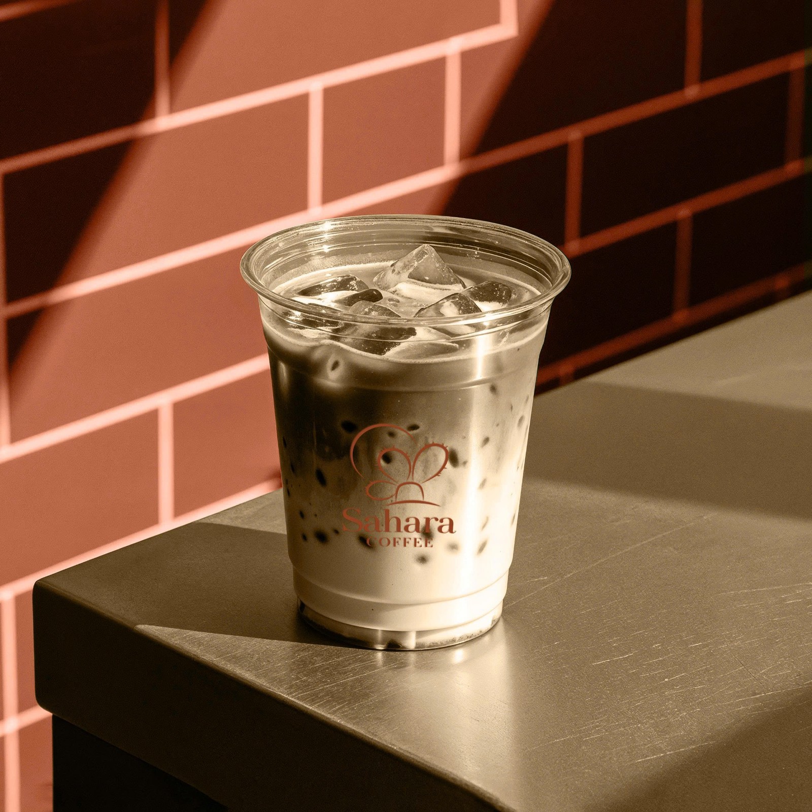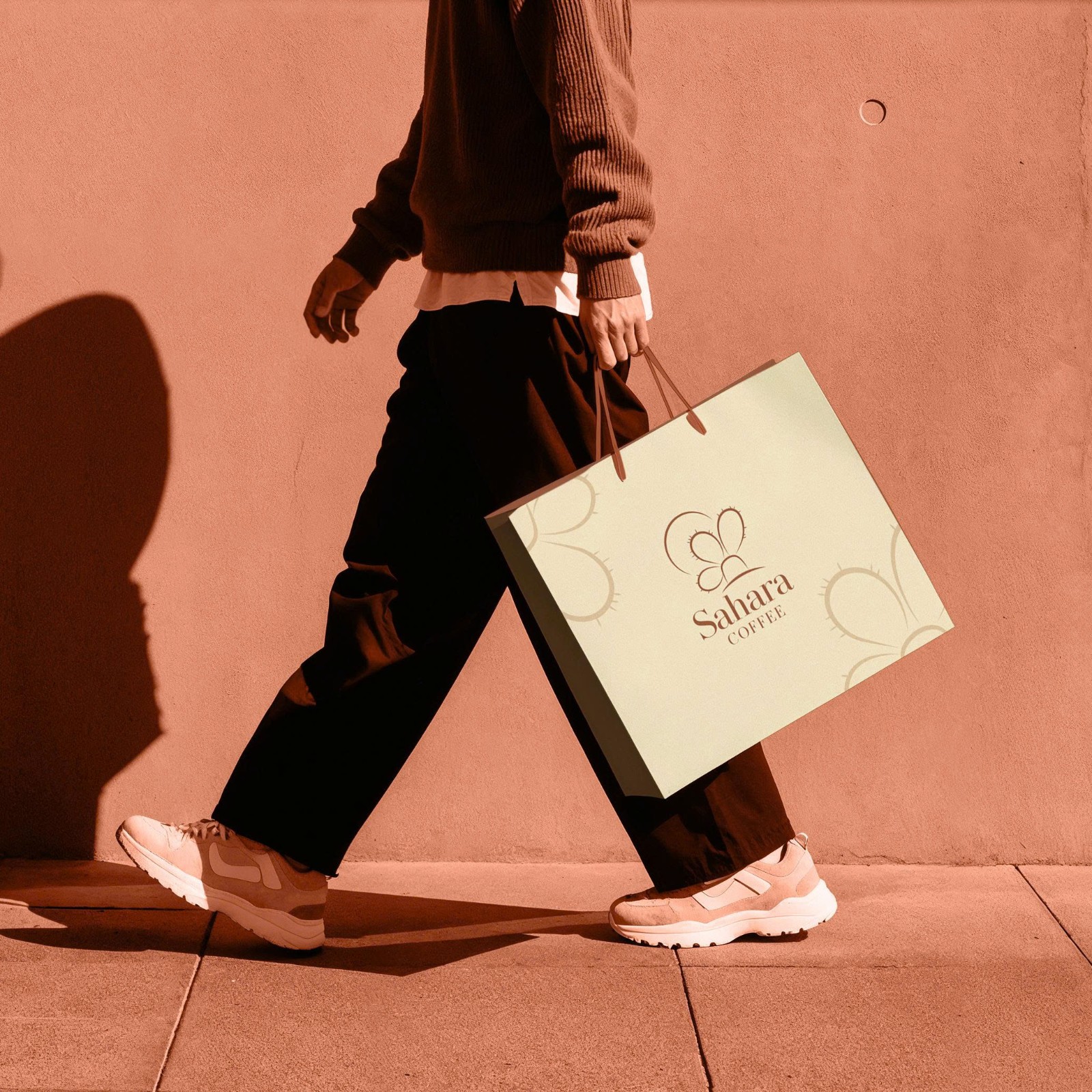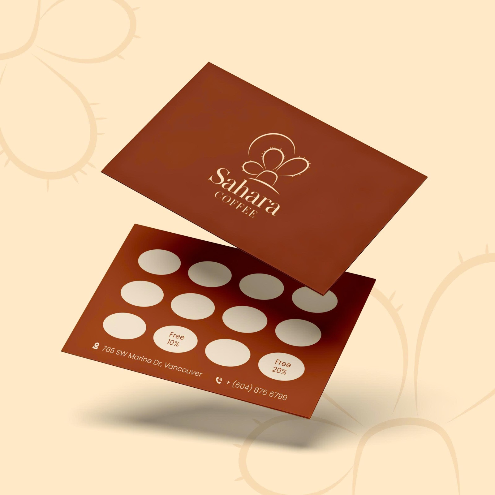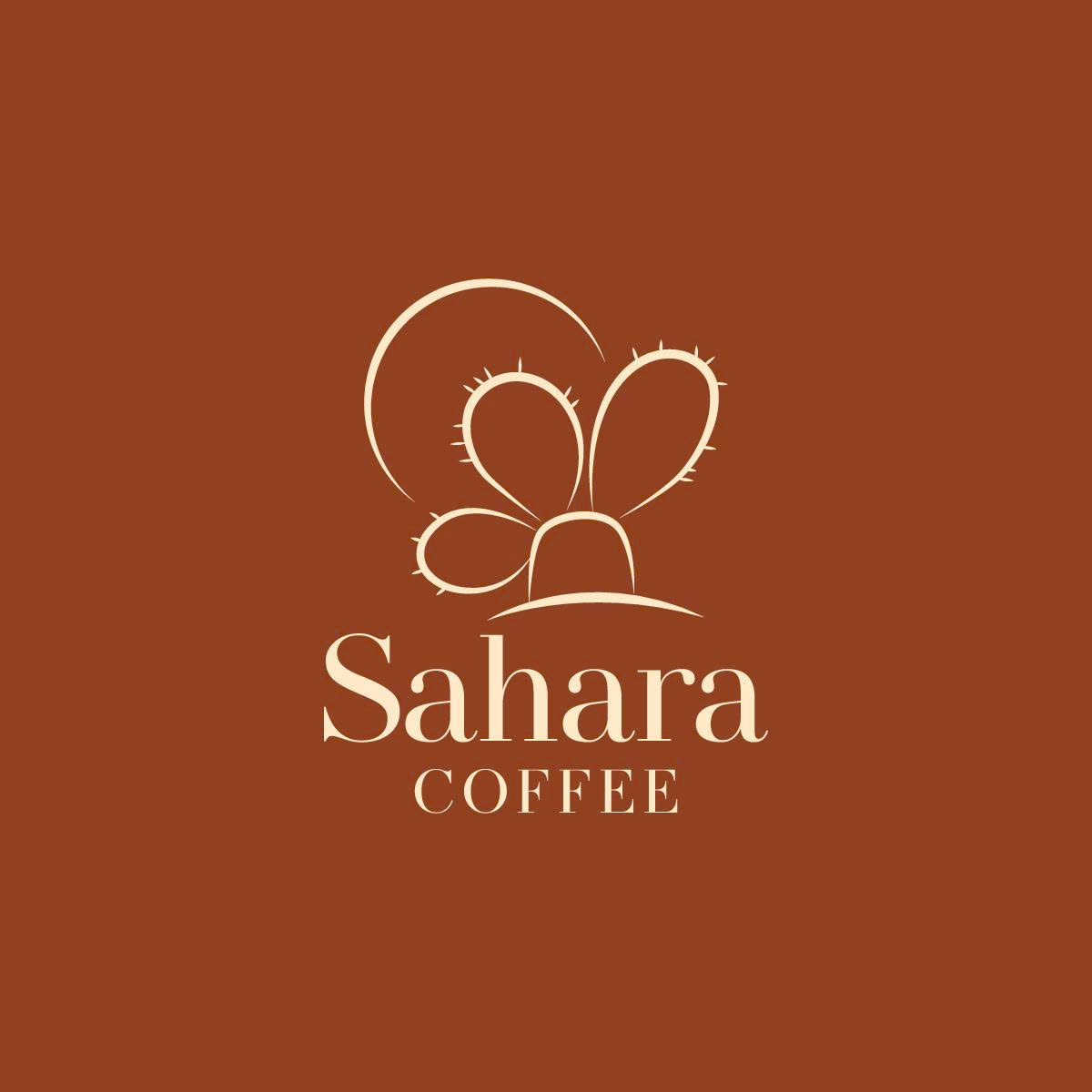 Màu nâu đất làm nền gợi liên tưởng đến cà phê rang và màu cát sa mạc, trong khi sắc be sáng mang đến sự hài hòa, thanh thoát. Kiểu chữ “Sahara” sử dụng font serif sang trọng, xen lẫn nét dày và mảnh, tạo sự cổ điển và tinh tế; còn “COFFEE” in hoa chắc chắn, nhấn mạnh sản phẩm cốt lõi của thương hiệu. Cũng như xương rồng sống mãnh liệt giữa hoang mạc, hạt cà phê phải trải qua khắc nghiệt để tạo nên hương vị đậm đà. Mỗi tách cà phê là lời nhắc nhở về sức sống bền bỉ, nguồn năng lượng mạnh mẽ và cảm hứng bất tận.