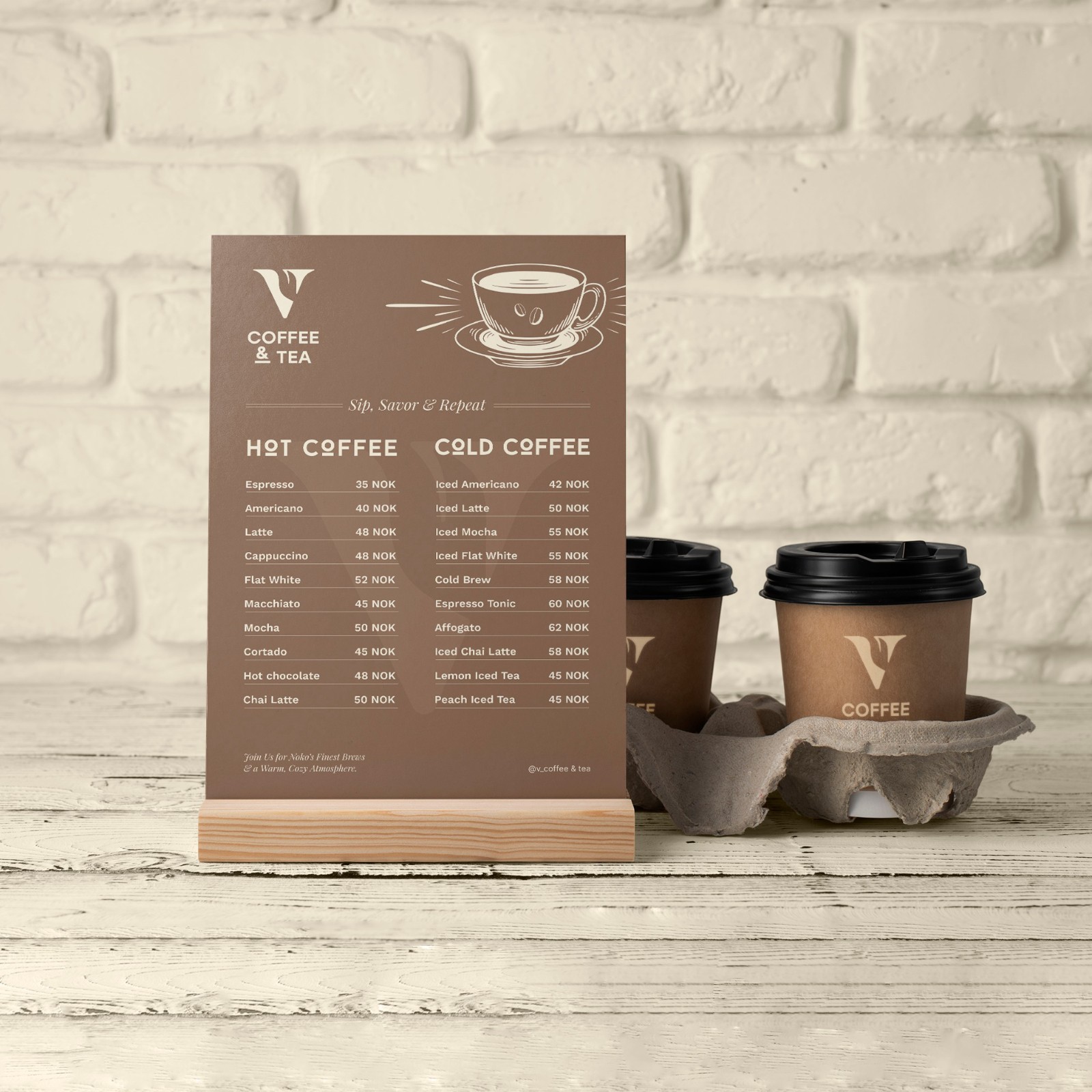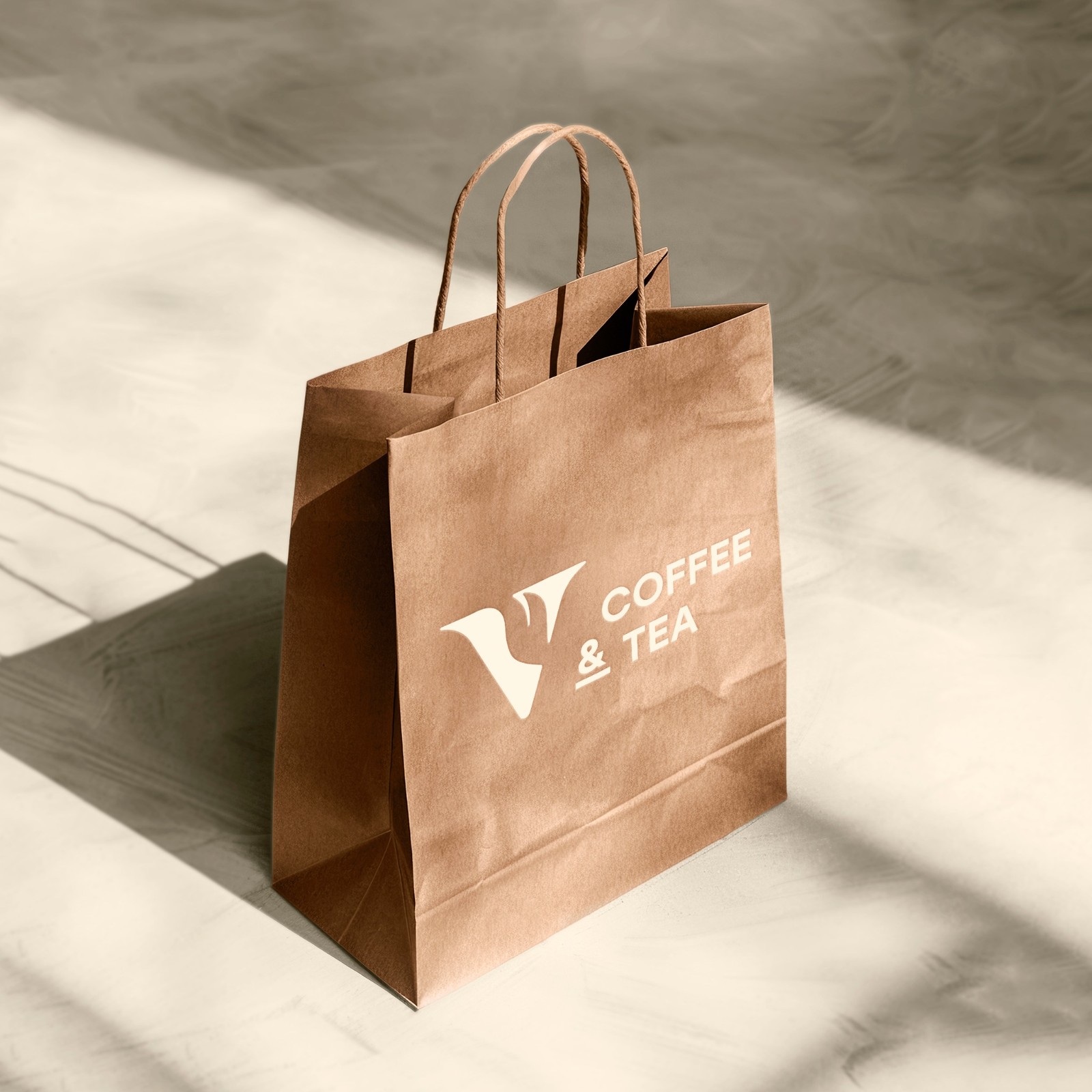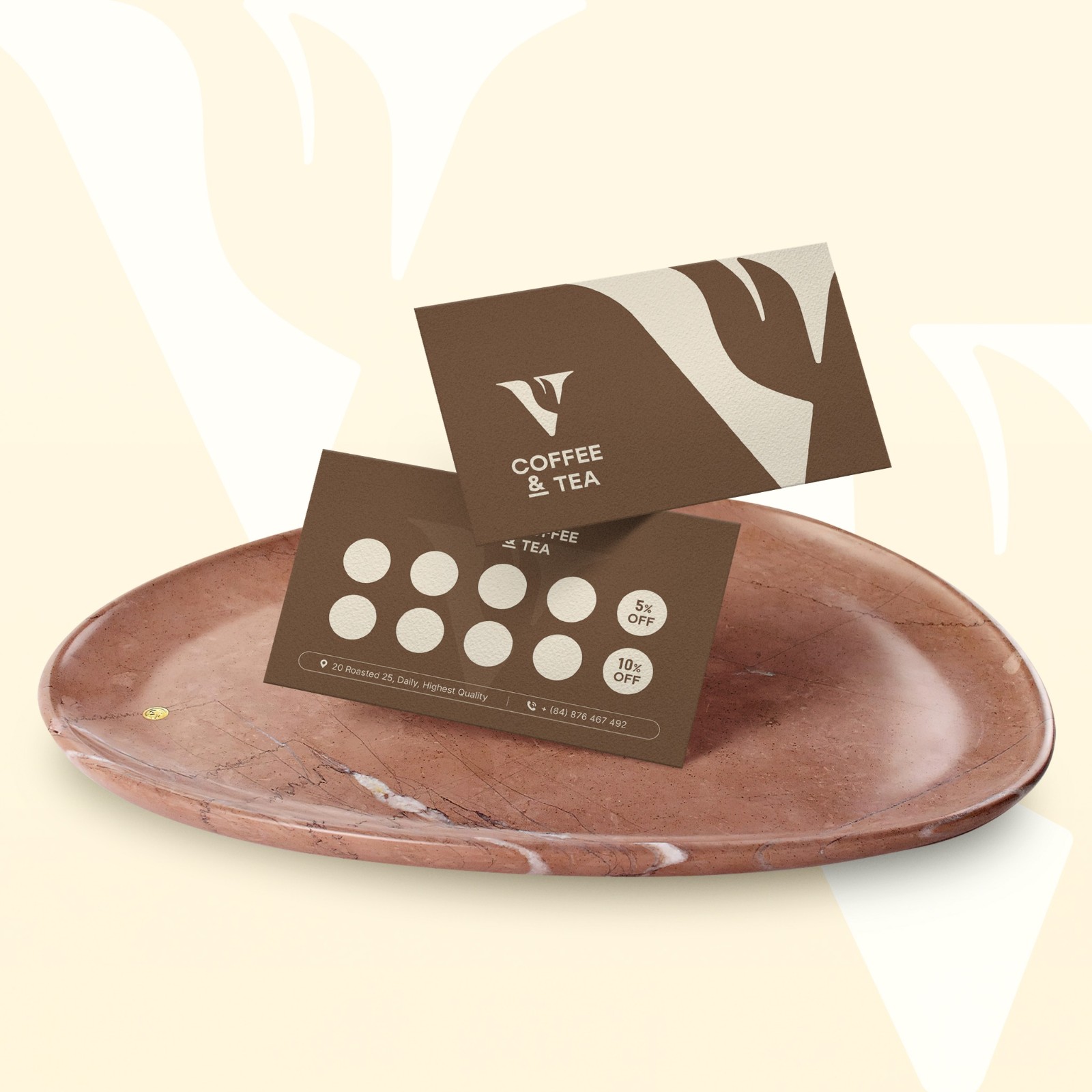 Phần typography “COFFEE & TEA” được xử lý rõ ràng, cân đối, tạo cảm giác vững vàng và chuyên nghiệp. Dấu “&” được nhấn nhẹ bằng đường gạch dưới như một điểm neo thị giác, cân bằng bố cục và tạo nét nhận diện riêng biệt.