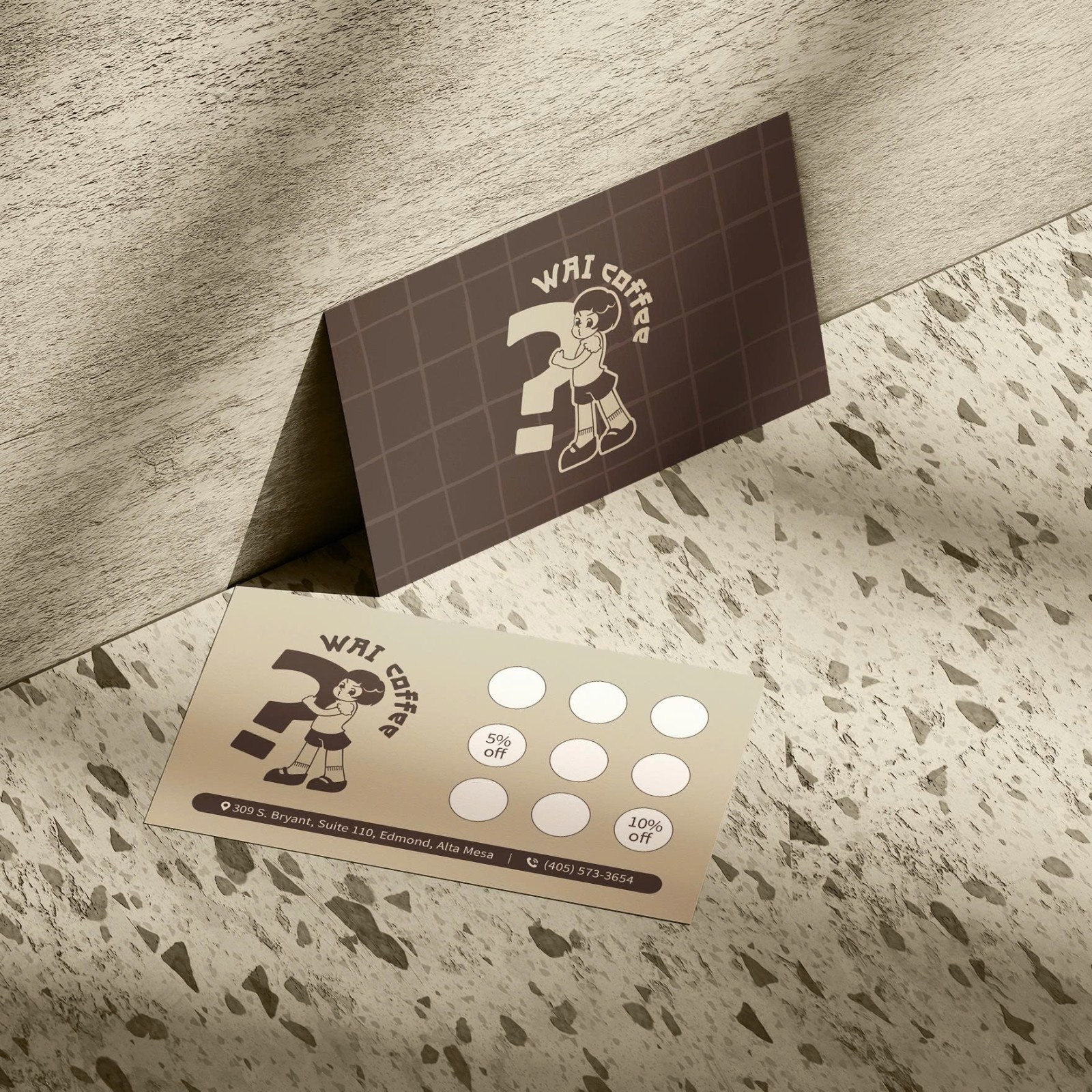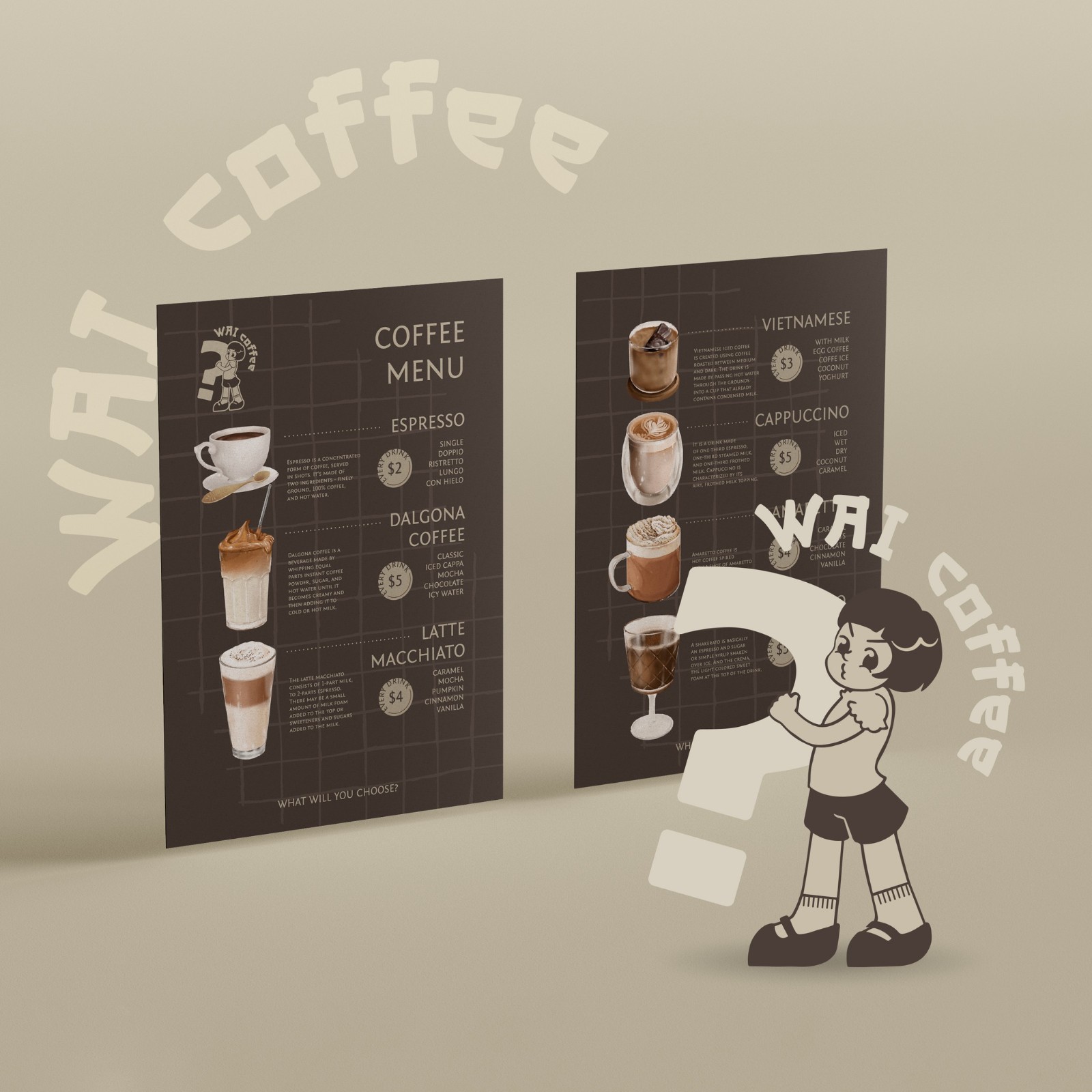 Tone nâu cà phê ấm áp kết hợp nền caro retro tạo cảm giác hoài niệm và an toàn. Typography uốn cong theo chuyển động nhân vật như thể đang thì thầm một câu hỏi nhỏ. Tổng thể logo mang hơi thở trẻ trung, tinh nghịch nhưng vẫn đủ chiều sâu để kể một câu chuyện thương hiệu rõ ràng: WAI COFFEE là nơi dành cho những người đang đi tìm lý do và có thể, tìm lại chính mình.